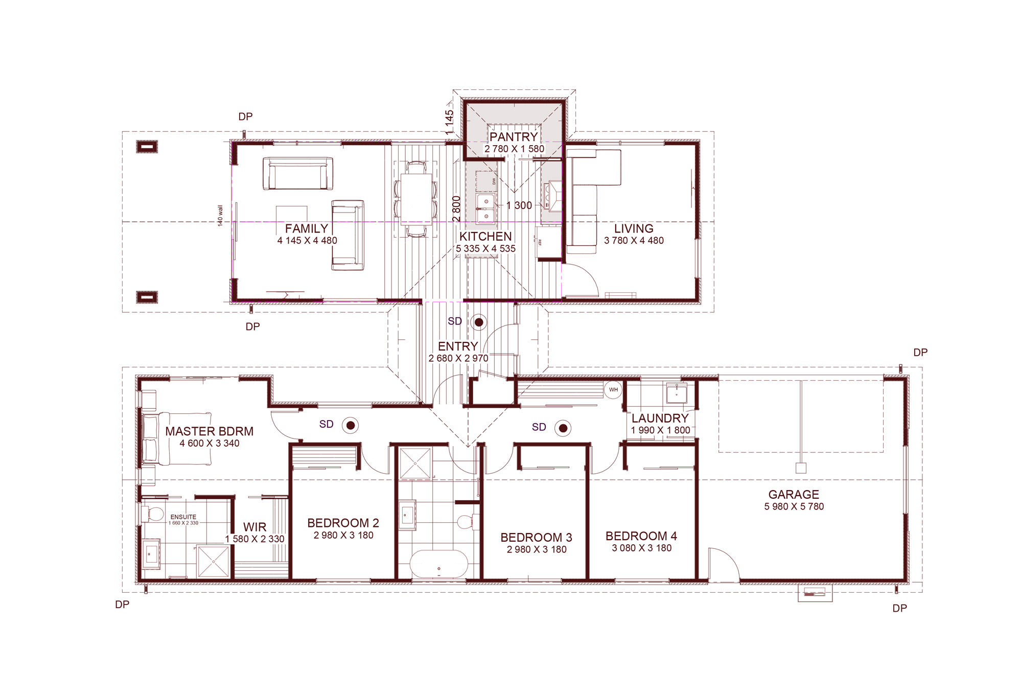 Welcome to a contemporary four-bedroom home plan that combines style and practicality. This well-designed residence features two chic bathrooms with tiled finishes and a skylight in the ensuite for a touch of luxury.