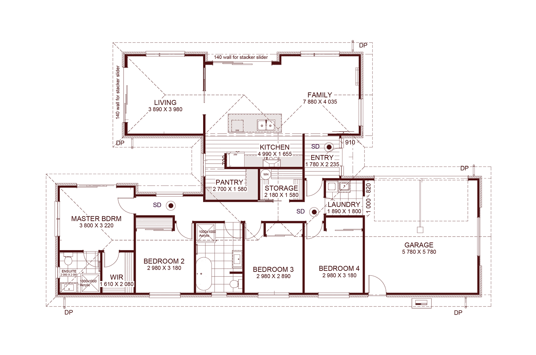 With two light and sunny family areas, both with stacking sliding doors, this design offers versatile spaces for relaxation and gatherings. Additional thoughtful touches include a walk-in storage cupboard and a strategically placed window in the hallway, ensuring ample natural light throughout the home.